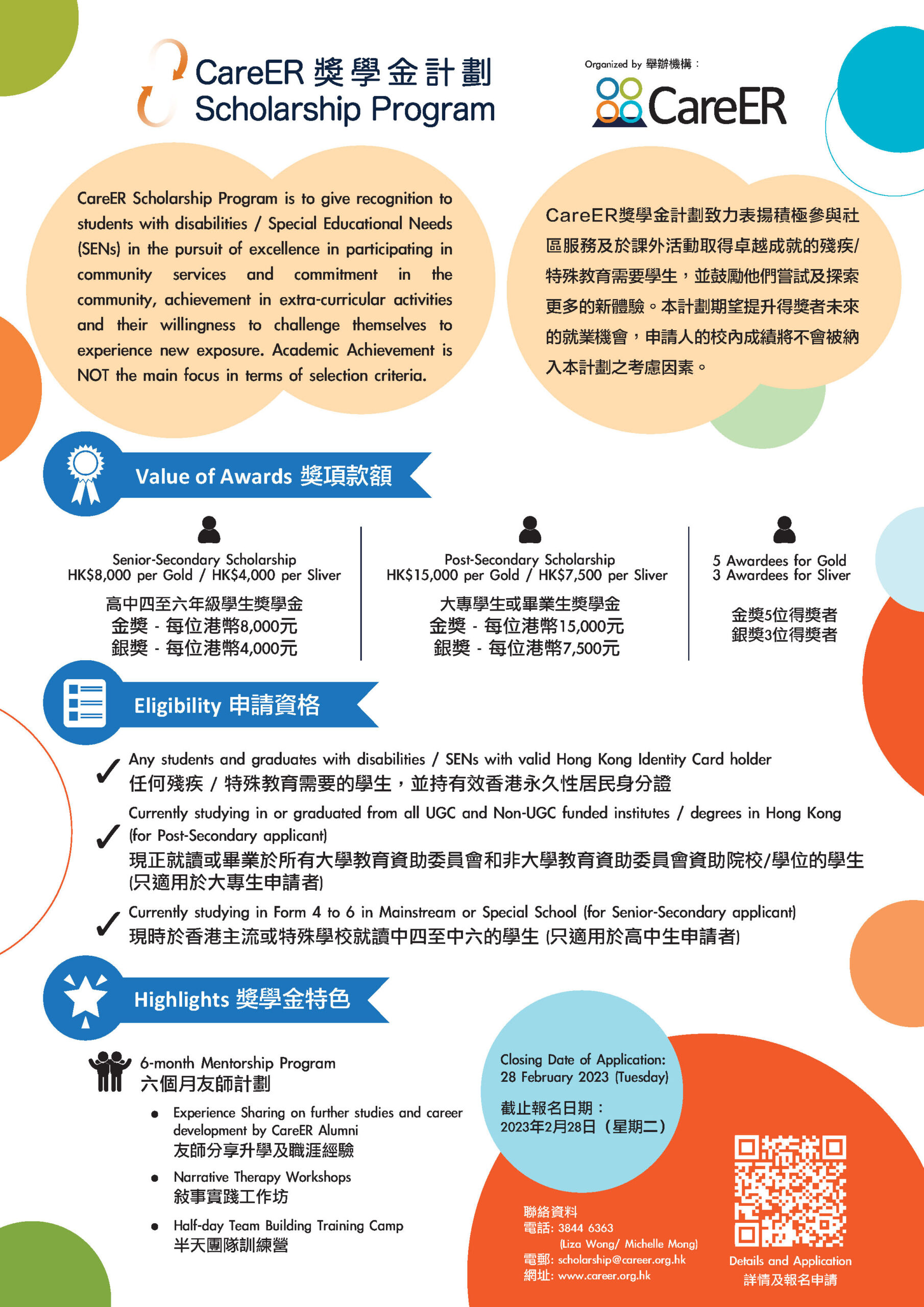 如有任何疑問,請致電3844 6363或電郵至 scholarship@career.org.hk了解更多。